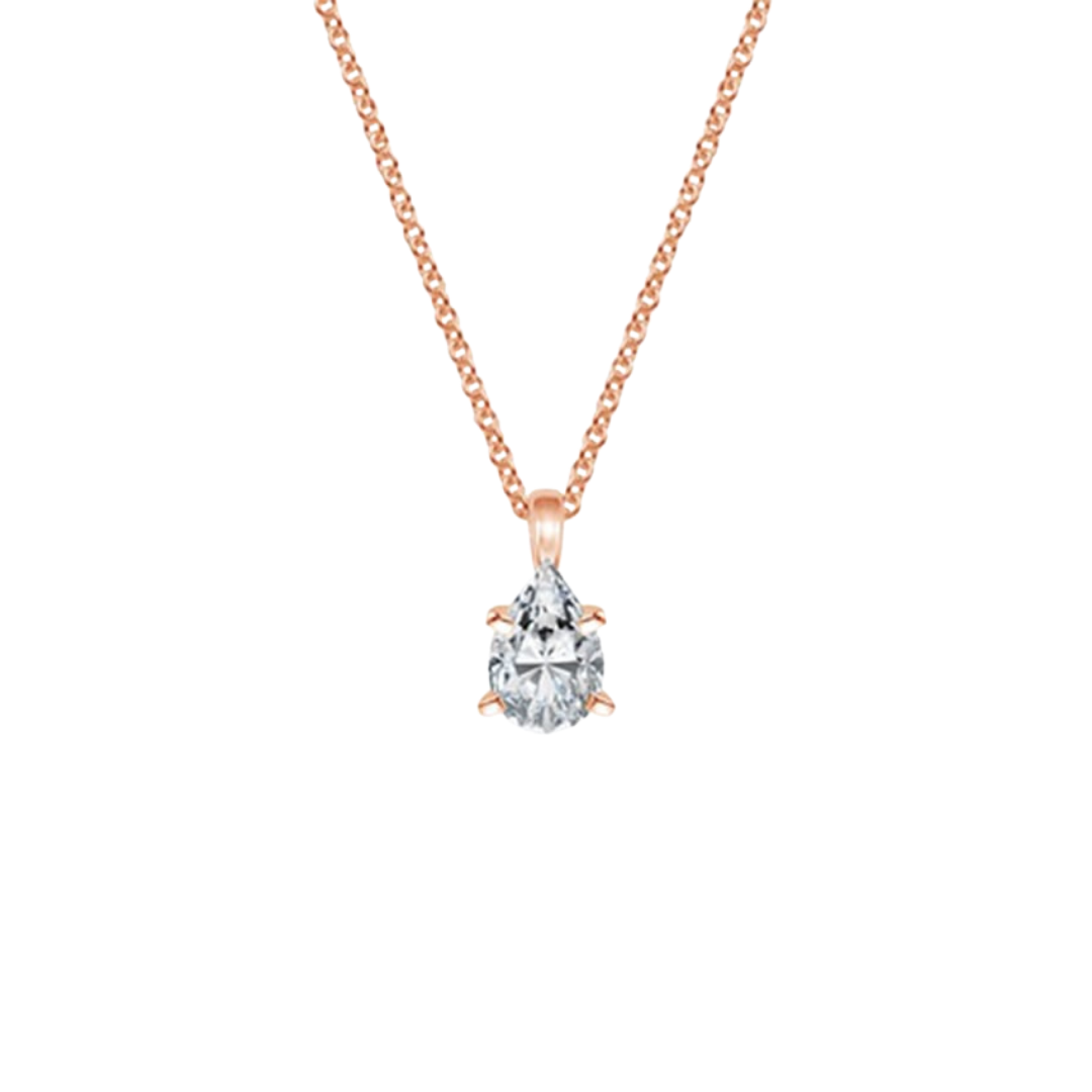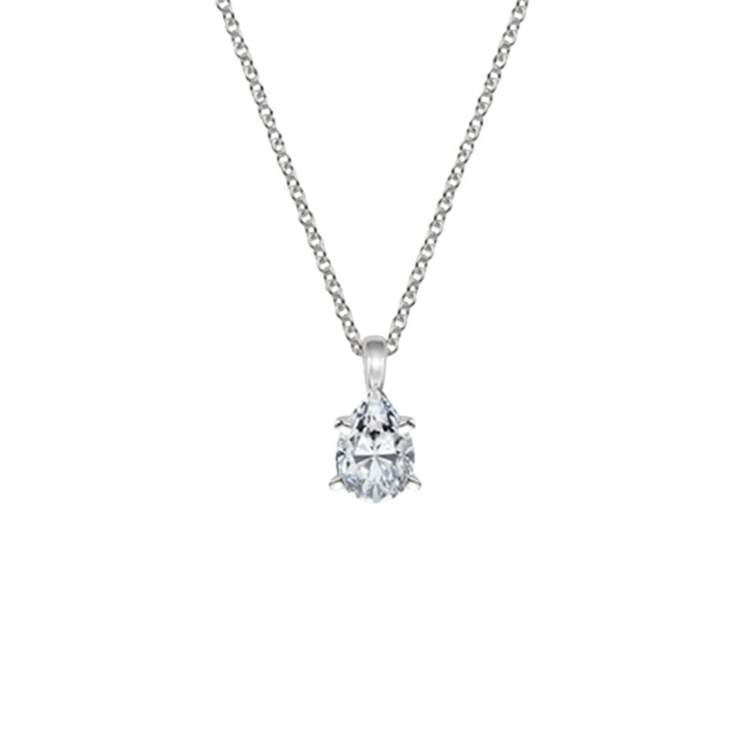 The Pear cut is admired for its distinctive step-cut facets and geometric symmetry, creating a captivating “hall-of-mirrors” effect. The four-prong setting allows maximum light to pass through the diamond, enhancing clarity and brilliance while maintaining a graceful, minimal look. A sleek single bail design ensures the pendant hangs perfectly centered on the neckline.