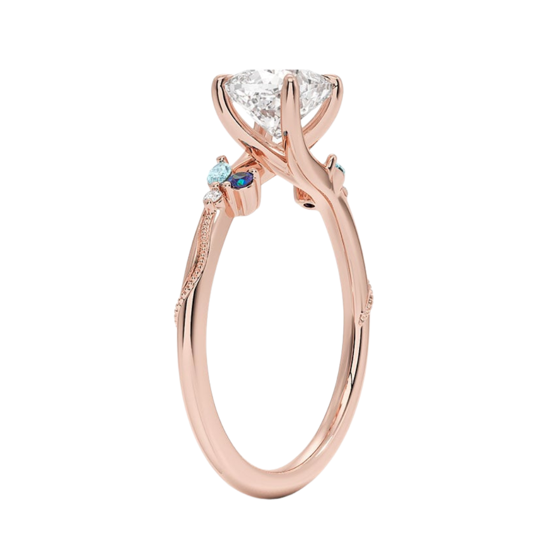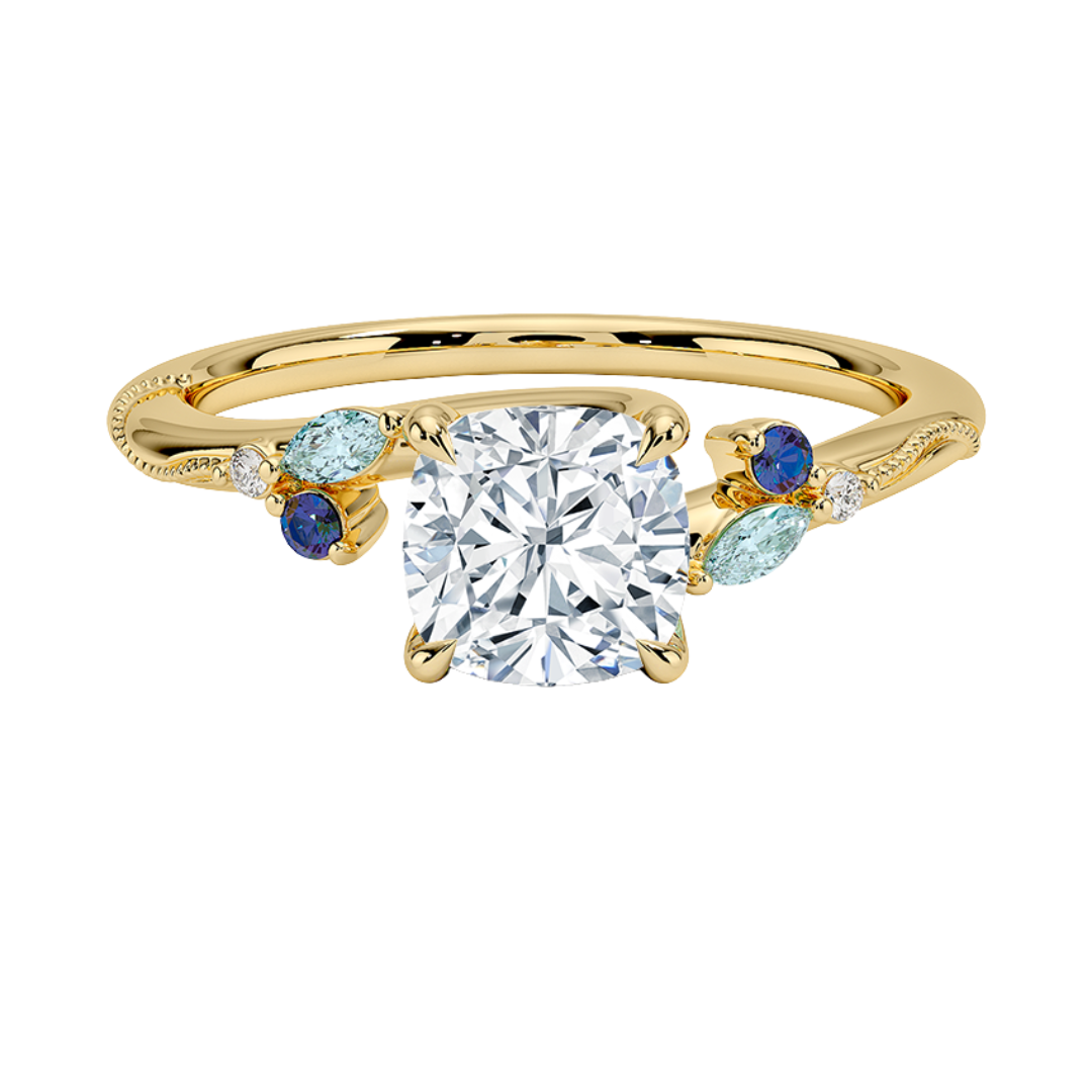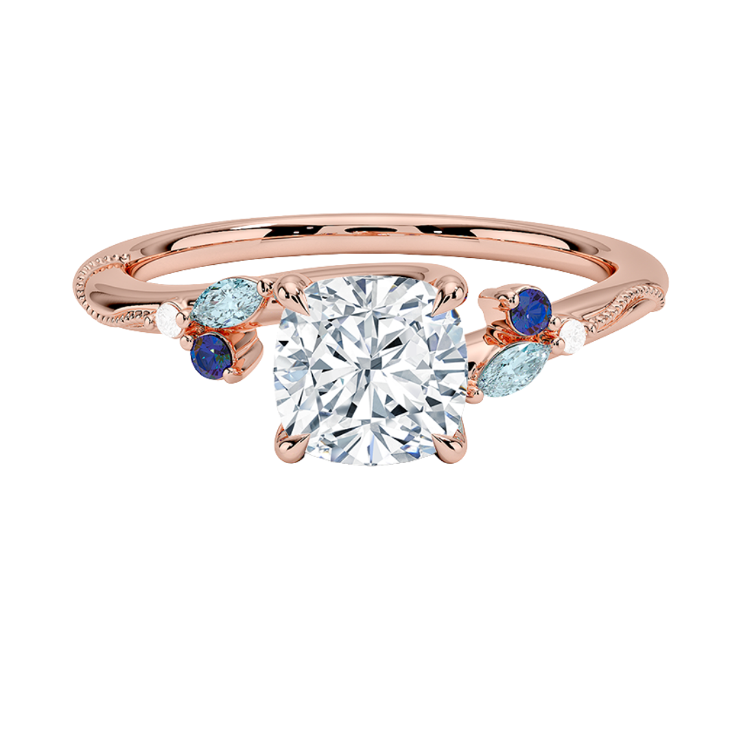 1 TO 5 CT Camellia Cushion Cut Lab Grown Diamond Ring with Indigo Accents & Milgrain in Gold | Pooja Diamond | IGI Certified Lab Diamond