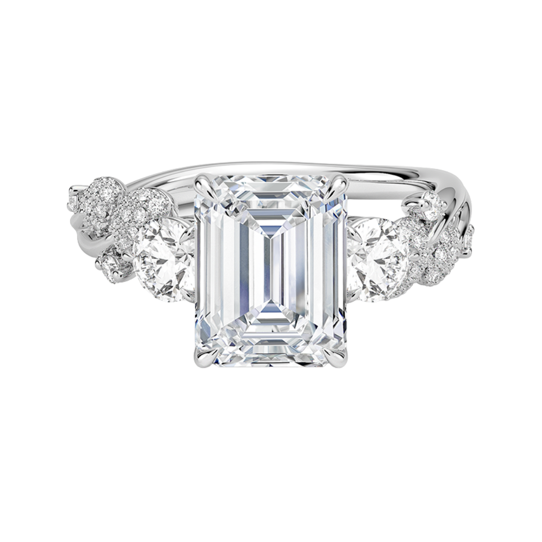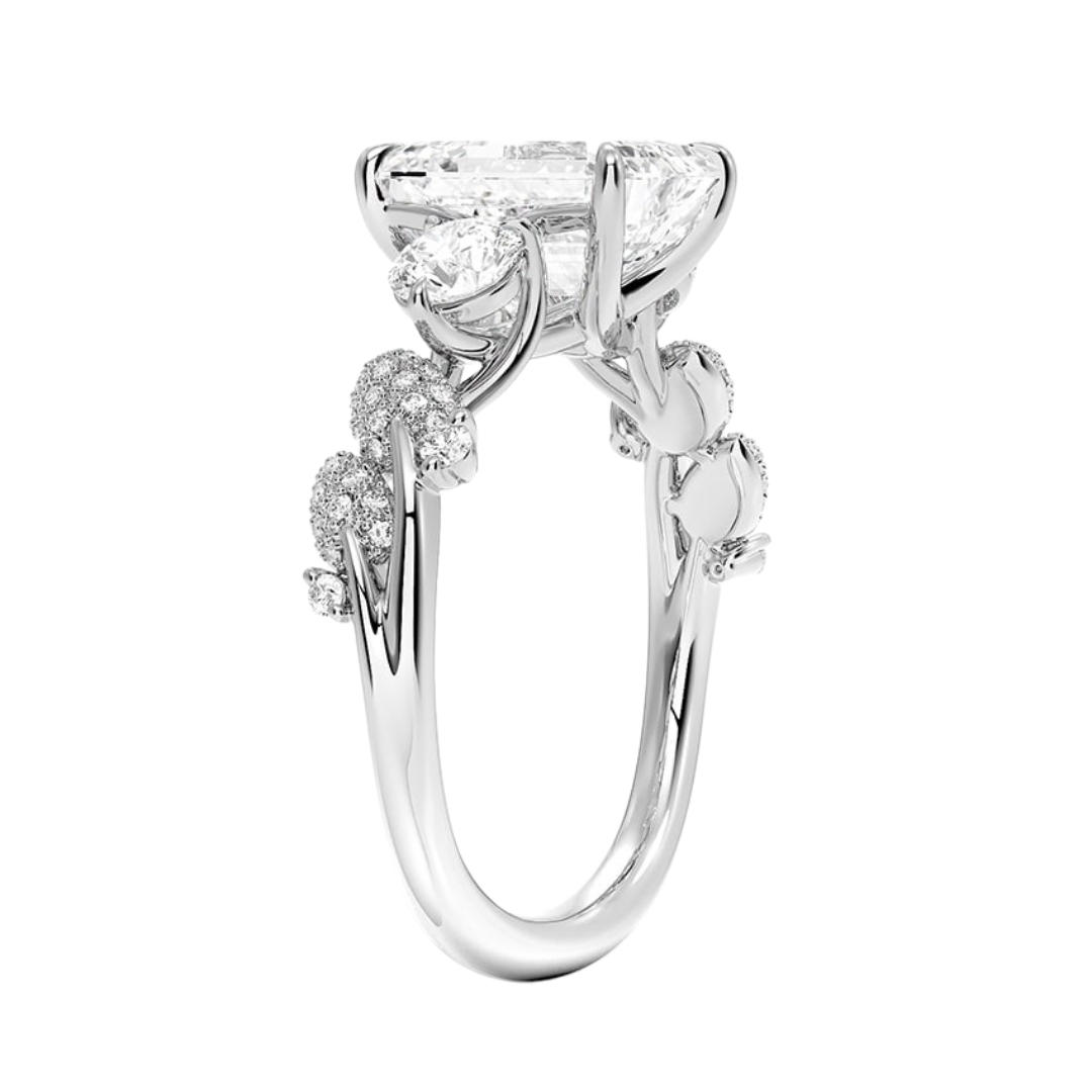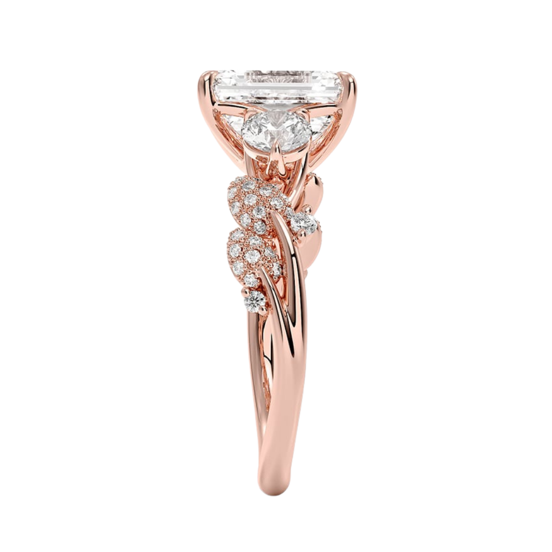 1 To 5 CT Canopy Three Stone Lab-Grown Diamond Ring in 10K/14K/18K Gold – Emerald Cut Center with Nature-Inspired Round Diamond Accents | Pooja Diamond | IGI Certified Lab Diamond