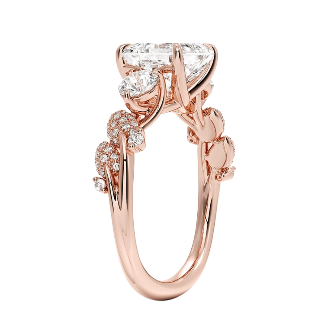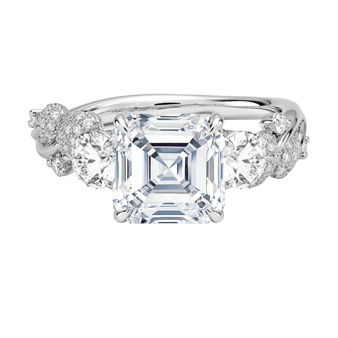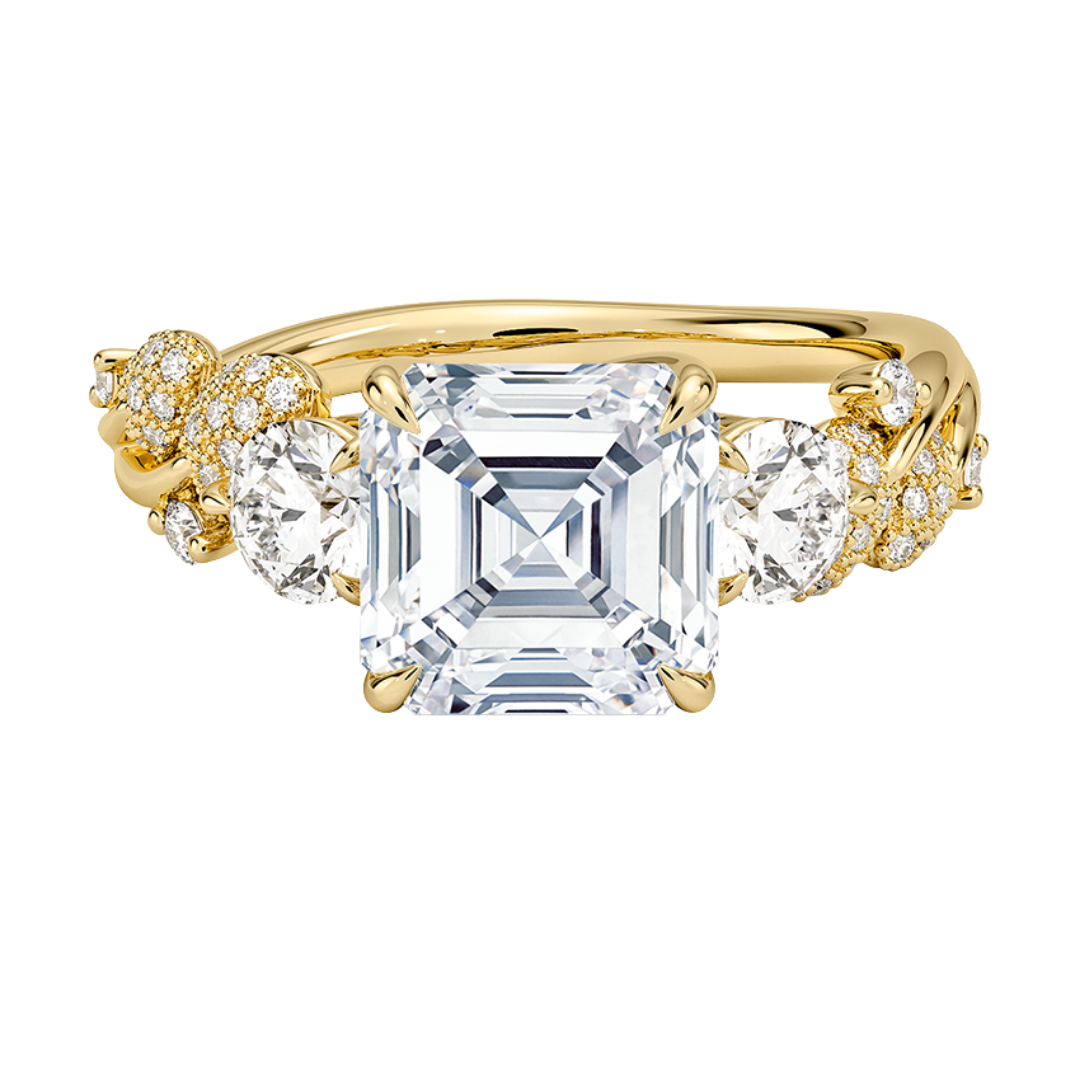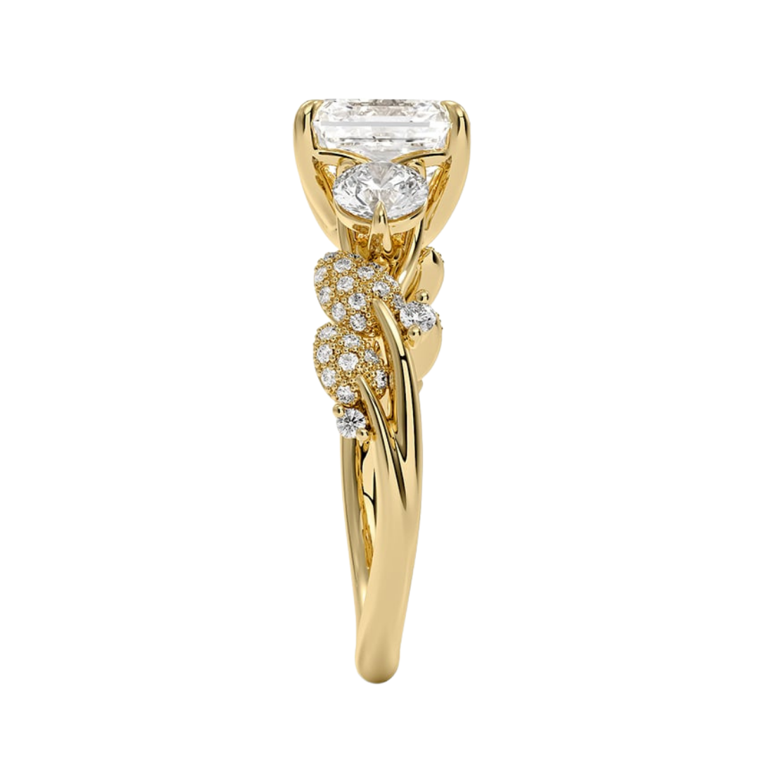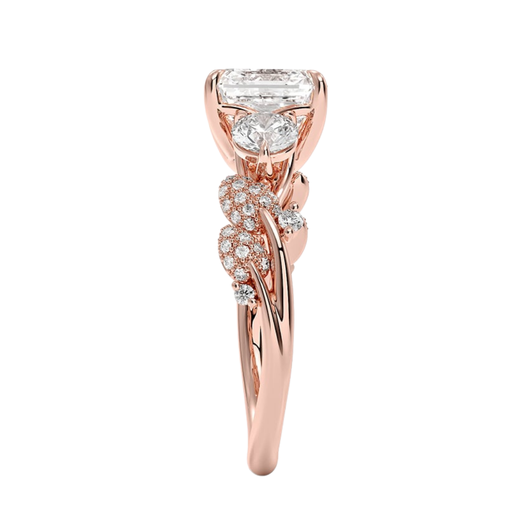 1 To 5 CT Canopy Three Stone Lab-Grown Diamond Ring in 10K/14K/18K Gold – Asscher Cut Center with Nature-Inspired Round Diamond Accents | Pooja Diamond | IGI Certified Lab Diamond