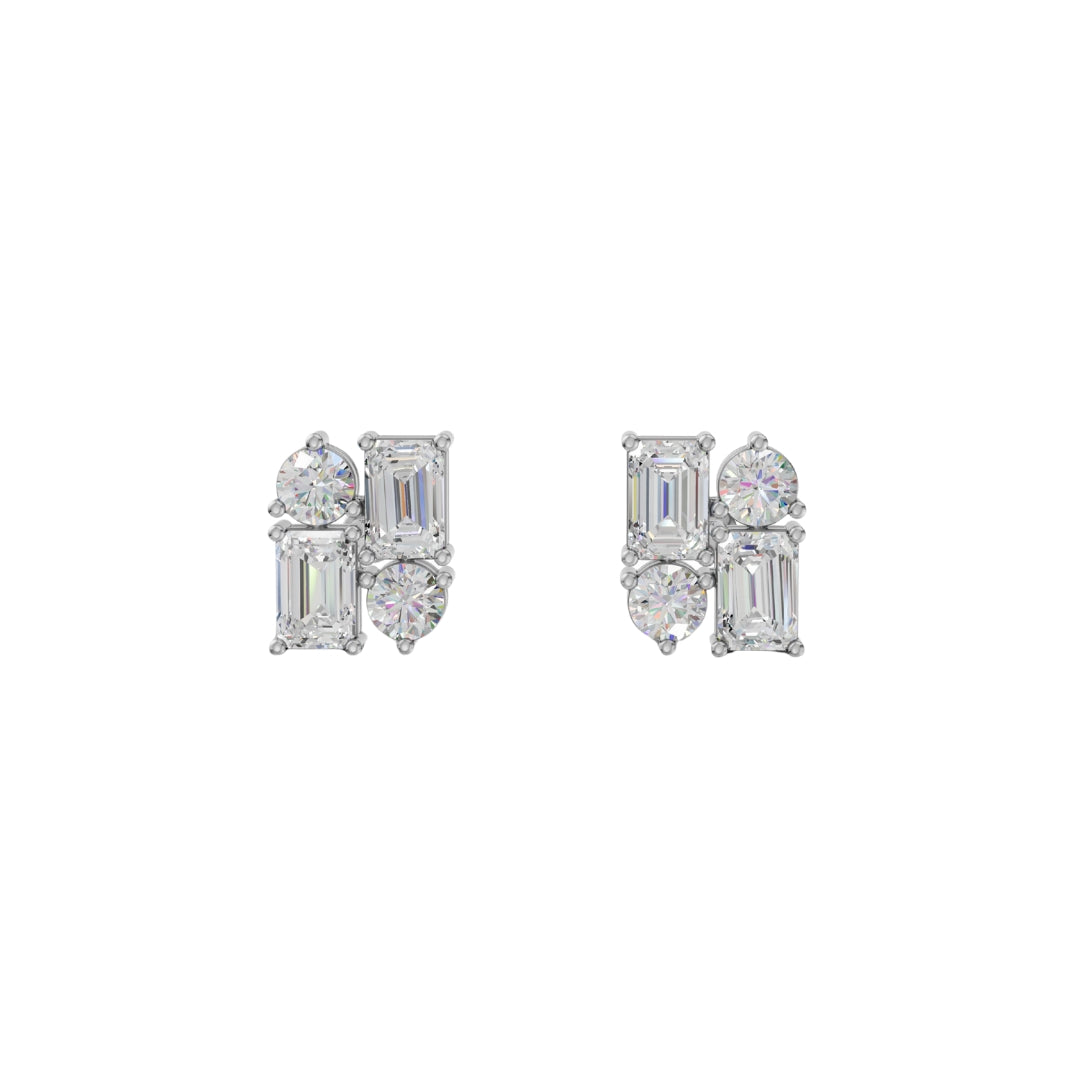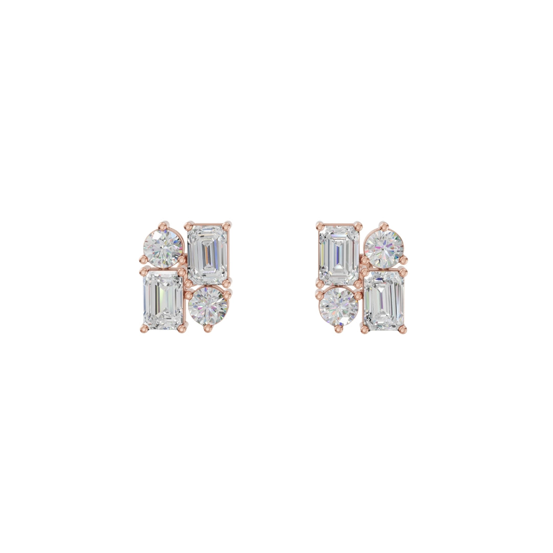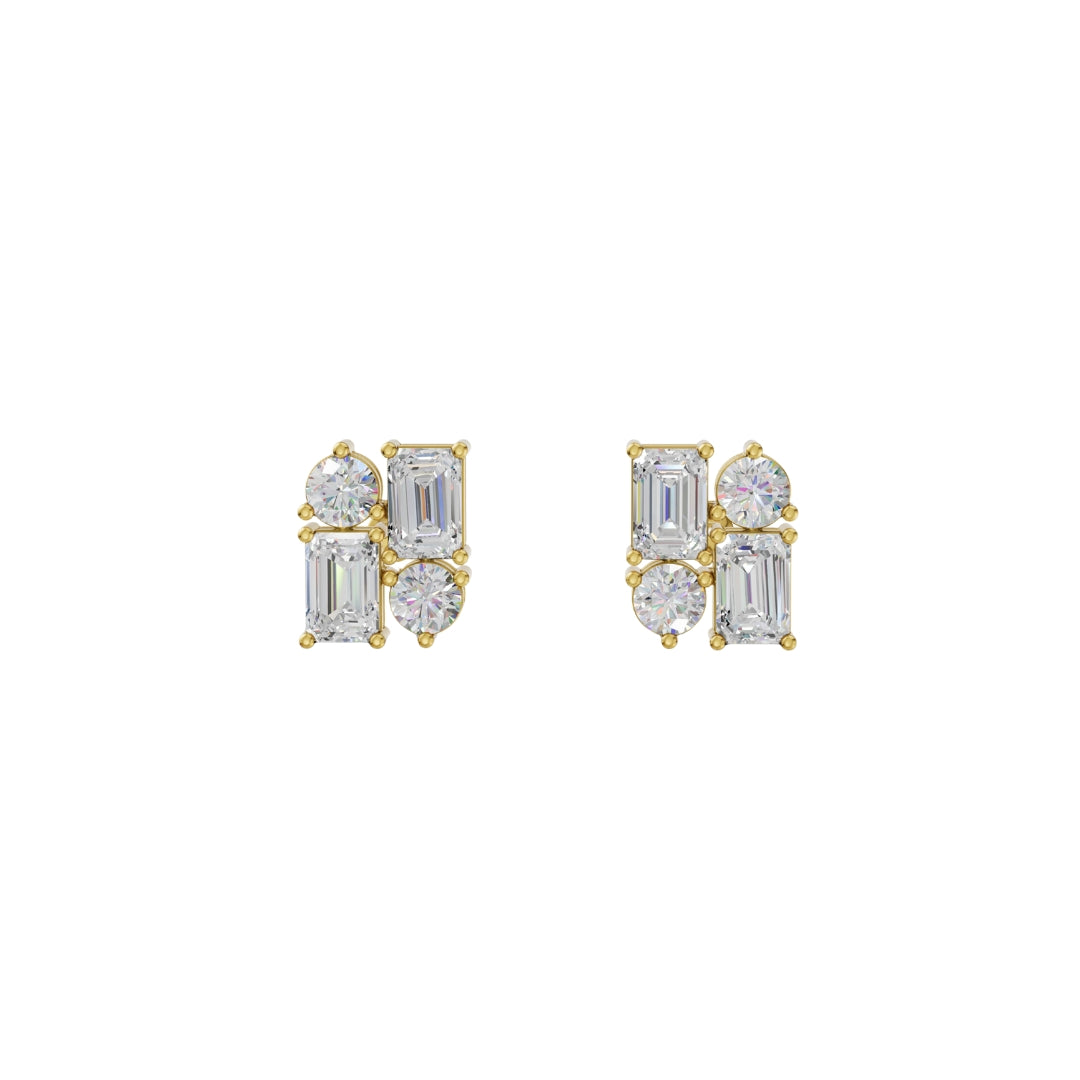 Lab Grown Diamond Geometric Stud Earrings | Emerald & Round Cut | Modern Cluster Diamond Earrings in 18K / 14K / 10K Gold