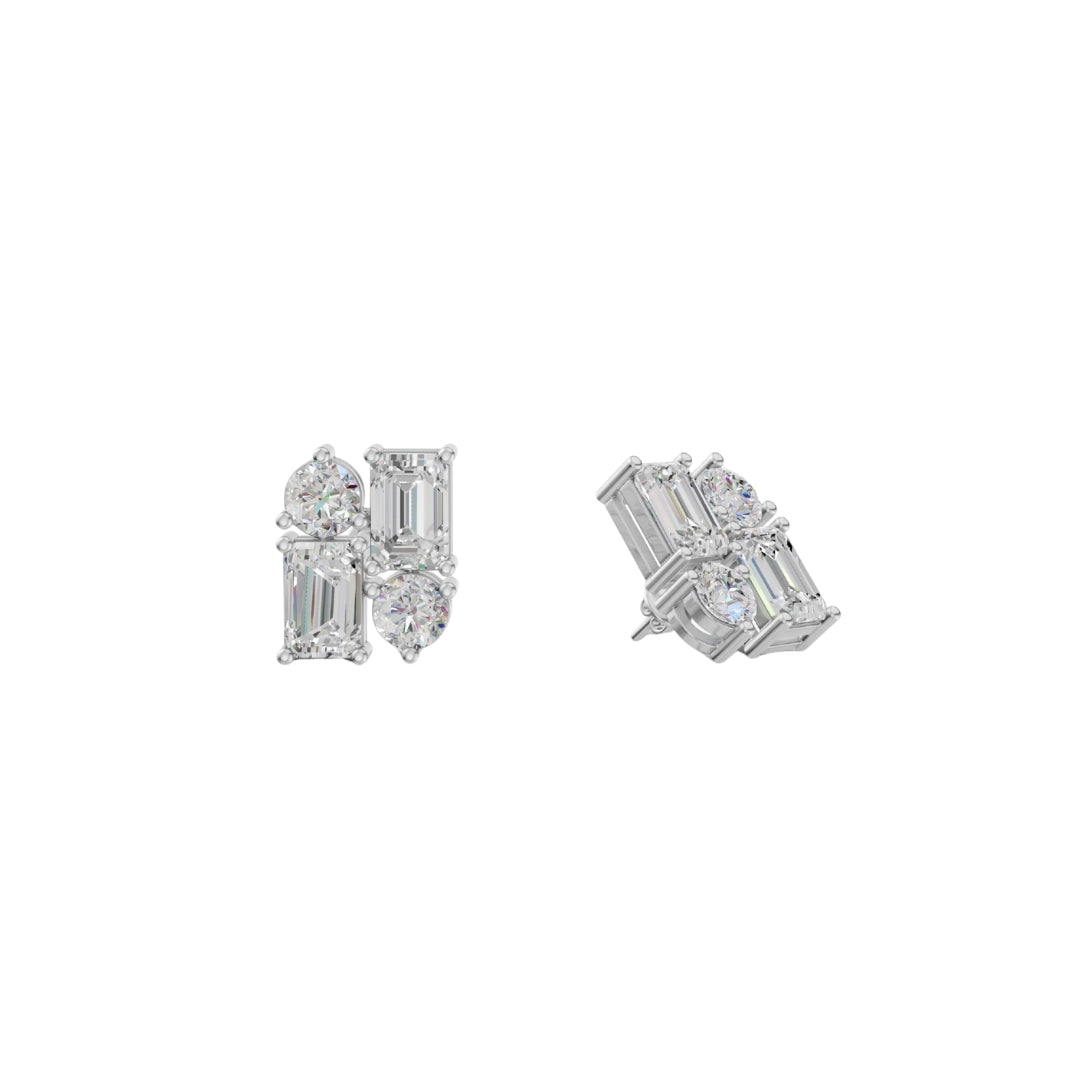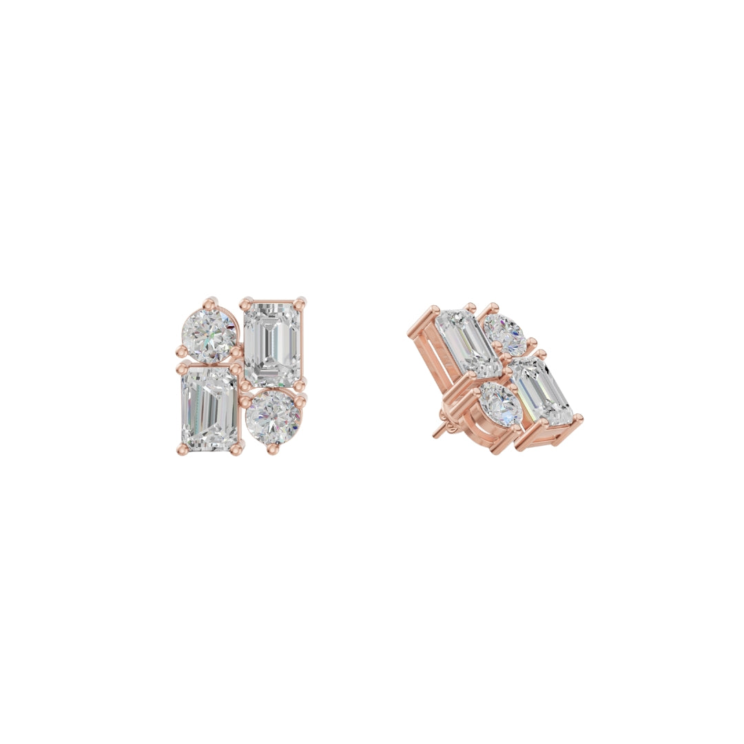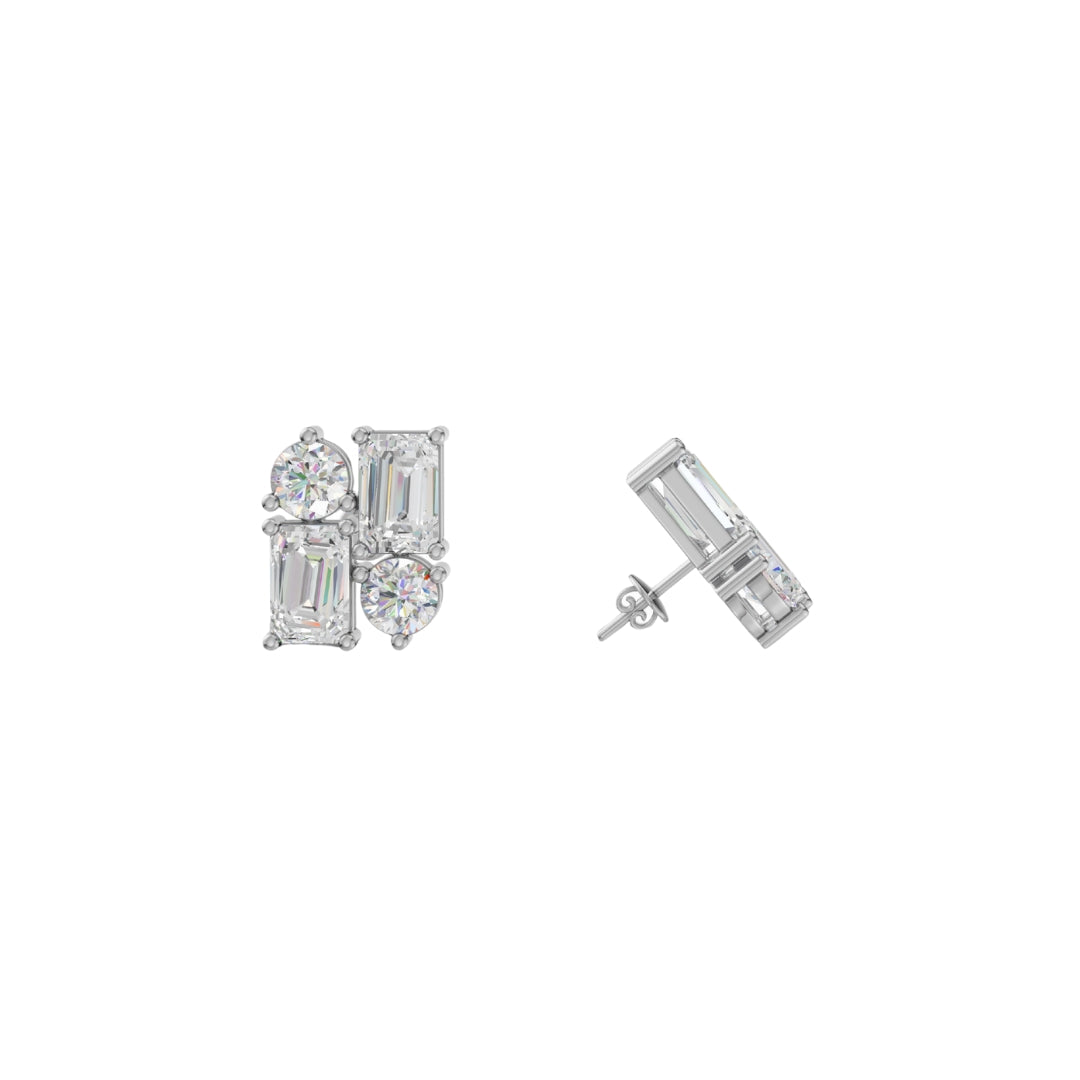 Lab Grown Diamond Geometric Stud Earrings | Emerald & Round Cut | Modern Cluster Diamond Earrings in 18K / 14K / 10K Gold